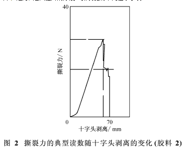 以180°的角度、在23°C下以100 mm/min的十字頭速度,在Lloyd機械性能試驗機上進行褲形撕裂試驗。產(chǎn)生的撕裂長度大約在22~75 mm之間不等。在圖表上記錄下各次實驗的撕裂力,由此形成一條曲線,計算出平均力(圖2)。有5塊試片發(fā)生破裂,由公式(1)計算出撕裂能: