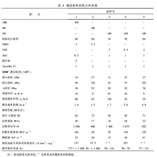 為提高填充白炭黑、TBBS和氧化鋅的SBR和BR的硫化效率,還添加了不超過2. 5份的硬脂酸??偣仓苽淞?3種膠料。