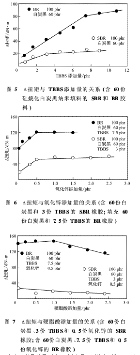 ●在填充白炭黑60份時,欲使橡膠-填料相互作用達到最佳, SBR需要3份TBBS,BR需要7. 5份TBBS。不過,欲使TBBS的效率達到最佳只需要0. 5份氧化鋅。