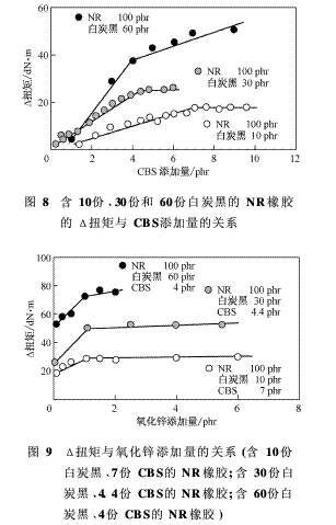 對于一定的橡膠, CBS的需要量取決于白炭黑的配合量,但其對氧化鋅的需求量與白炭量和CBS的配合量無關(guān)。