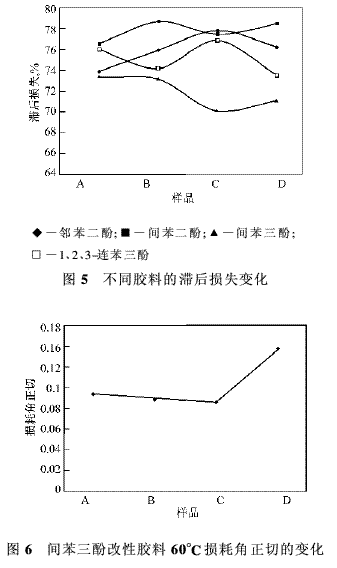 交聯(lián)密度的形成和晶體結(jié)構(gòu)緊密性的提高,可從生熱性改善這一現(xiàn)象得到證實(shí)(如圖4所示)。另外,滯后損失降低(見(jiàn)圖5)也說(shuō)明了這樣一個(gè)事實(shí),即對(duì)含有表面改性炭黑的膠料的應(yīng)力軟化效果增強(qiáng)了。對(duì)間苯三酚以及間苯二酚來(lái)說(shuō),改善效果更加突出。這些動(dòng)態(tài)性能的結(jié)果與靜態(tài)性能的結(jié)果相符。