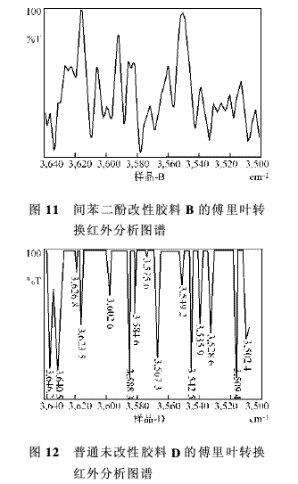 為了確認(rèn)上面這一事實(shí),用傅里葉轉(zhuǎn)換紅外分析研究和X射線衍射分析的方法進(jìn)行了表征研究。對(duì)間苯二酚改性膠料采用傅里葉轉(zhuǎn)換紅外分析進(jìn)行研究。結(jié)果表明,有大量的羥基束縛于由填充劑-彈性體基質(zhì)構(gòu)成的硫化膠的表面,這些膠料具有雙重而且強(qiáng)烈的峰值,如圖11(改性試樣B的傅里葉轉(zhuǎn)換紅外分析圖譜)和圖12(未改性試樣D的傅里葉轉(zhuǎn)換紅外分析圖譜)所示。間苯三酚也具有同樣的模式。間苯三酚改性膠料C及其普通膠料D在未拉伸和拉伸條件下的X射線衍射分析(分別用代號(hào)C′和D′表示)得出的數(shù)據(jù)表明,與D′相比,膠料C′的峰值更加強(qiáng)烈,預(yù)示其晶體更加有序,故而形成了更加牢固的化學(xué)鍵,正如表1所示。