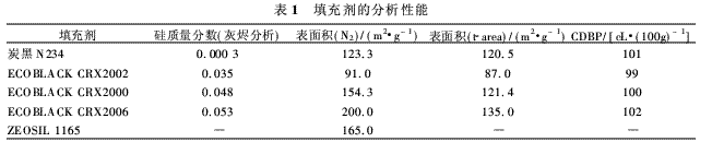 本研究所用的ECOBLACK填充劑為CRX2002,CRX2000和CRX2006,它們之間的主要區(qū)別在于表面積和白炭黑質(zhì)量分?jǐn)?shù)有所不同。以卡博特公司的一種炭黑VULCAN 7H(N234)和羅納-普朗克公司的一種白炭黑ZEOSIL 1165MD作對(duì)比填充劑。這些填充劑的分析性能見表1。