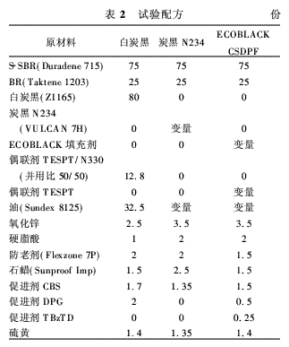 胎面膠試驗(yàn)配方以并用體系(S-SBR Du-radene 715/BR,并用比為75/25)為基礎(chǔ),添加不同用量填充劑及油。對(duì)于ECOBLACK填充劑,根據(jù)該類填充劑表面積和白炭黑質(zhì)量分?jǐn)?shù)的不同,將偶聯(lián)劑TESPT的用量作適當(dāng)調(diào)整。配方的詳細(xì)內(nèi)容見表2。
