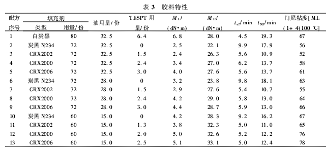 如表3所示,含有72份炭黑和E-COBLACK填充劑的膠料對(duì)比表明,盡管E-COBLACK填充劑膠料的結(jié)合膠質(zhì)量分?jǐn)?shù)特別高,但它們的門尼粘度還是比得上只用炭黑的對(duì)比膠料。在ECOBLACK填充劑中,其表面積較大的品種若與高用量的TESPT配合使用,則膠料粘度大大提高。摻有60份填充劑的膠料也產(chǎn)生了同樣效果,但摻有表面積較高的兩種ECOBLACK填充劑的膠料粘度比摻有炭黑的膠料高。同樣可以看出,增大油的用量是降低膠料粘度的有效方法。