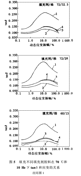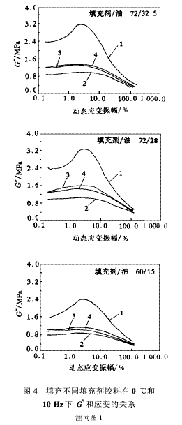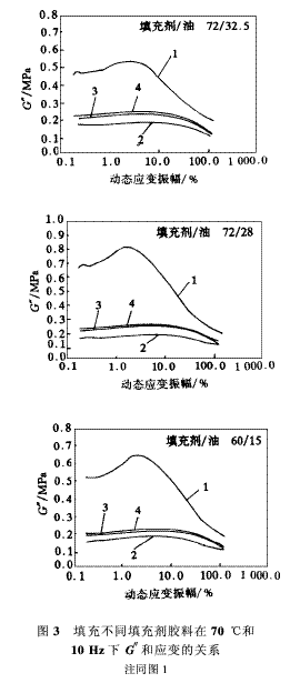 對(duì)于填充橡膠來(lái)說(shuō),G″主要與破壞后可以再次重建的填充劑網(wǎng)狀結(jié)構(gòu)有關(guān),這在某種程如圖3和4所示,在實(shí)驗(yàn)溫度分別為70和0℃,彈性模量隨著應(yīng)變振幅的增大而單調(diào)下度上取決于溫度,并與膠的熱活動(dòng)性或聚合物鏈的柔性有關(guān);其次與網(wǎng)狀結(jié)構(gòu)反復(fù)變形過(guò)程中的能量散失有關(guān)。不管怎樣,傳統(tǒng)炭黑和新型填充劑之間,在應(yīng)變和溫度與G″的關(guān)系方面的差別反映了填充劑網(wǎng)狀結(jié)構(gòu)的發(fā)展程度及強(qiáng)度。