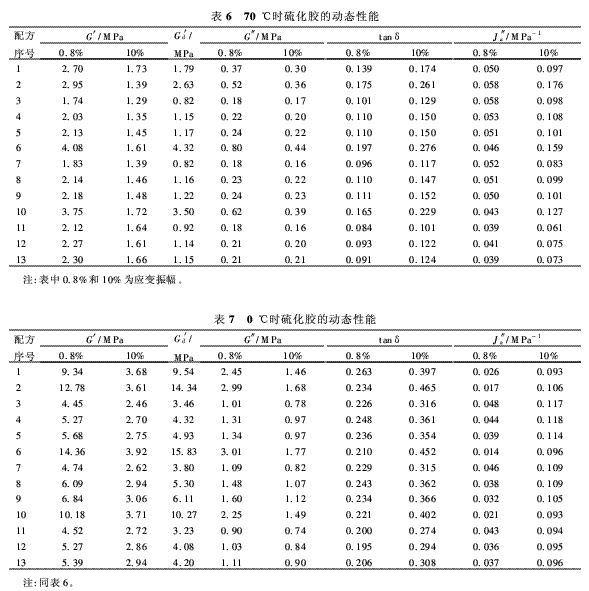 表5提供了室溫下以及70℃時(shí)測(cè)得的回彈性能結(jié)果。在這兩種溫度下,不管所采用的配方如何,都是炭黑的彈性最低而CRX2002的彈性最高。CRX2000和CRX2006也有類似的結(jié)果,比白炭黑膠的彈性也高得多。在高溫下膠料回彈性增高時(shí)填充劑/油比例順序?yàn)?2/28,60/15,72/32.5。