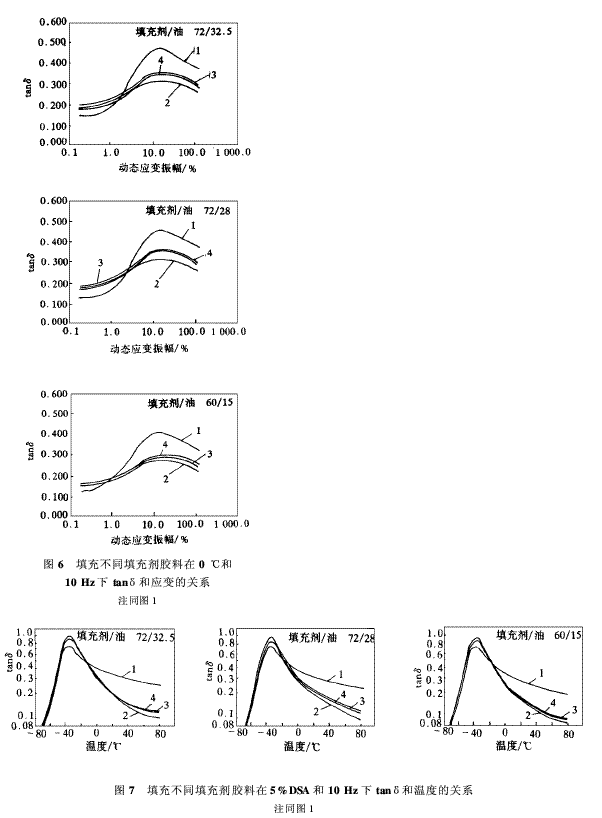 與振幅和彈性模量、粘性模量之間的關(guān)系并列的還有tanδ和振幅之間的關(guān)系。如對(duì)G″所觀測(cè)到的,tanδ隨著低應(yīng)變振幅下DSA的上升而上升至最大值,然后逐漸降低。與G″相比,tanδ最大值出現(xiàn)在較高的DSA下,而且雙相填充劑的峰值漸漸向較高應(yīng)變振幅移動(dòng)(圖4)。同時(shí),與炭黑和白炭黑相比,這種新型填充劑在70℃時(shí)的滯后損失得到了較大的改善(70和0℃時(shí)硫化膠的動(dòng)態(tài)性能見表6和7)。與VULCAN 7H炭黑膠料相比,不管填充劑和油的用量如何,雙相填充劑始終具有較低的滯后損失,這有助于降低輪胎的滾動(dòng)阻力。使用CRX2006,在應(yīng)變位移試驗(yàn)中,摻和72/32.5,72/28和60/15填充劑/油的膠料最大損耗因子tanδmax分別下降43%,48%和49%。當(dāng)使用CRX 2002時(shí),下降值分別為51%,59%和56%。CRX2000和CRX2006之間沒有很大的區(qū)別。如按參考文獻(xiàn)[8]所述,填充膠料的滯后損失主要與填充劑網(wǎng)狀結(jié)構(gòu)的破裂和重建有關(guān),那么雙相填充劑填充膠低tanδ的原因應(yīng)歸于填充劑聚集作用較輕。如果情況確實(shí)如此,則可預(yù)期大粒子ECOBLACK填充劑的滯后損失較低,因?yàn)樵谟昧肯嗤那闆r下,聚集體之間的平均距離與填充劑粒徑大小成正比。聚集體間的距離越大,填充劑絮凝聚趨勢(shì)就越小。