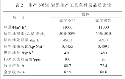 從事過炭黑生產(chǎn)的人都知道,因N660炭黑比 表面積較低,生產(chǎn)時原料油油風(fēng)比較高,在生產(chǎn)風(fēng)量 一定時,原料油處理越高,生產(chǎn)時結(jié)焦的可能性越 大,產(chǎn)品中存在焦粒的可能性越高。本公司生產(chǎn)N660炭黑曾有一段時間,油風(fēng)比相當(dāng)高,原料油在 喉管處結(jié)焦嚴(yán)重,用壓縮空氣進行霧化不足以解決 結(jié)焦問題。為了解決結(jié)焦,本人嘗試了許多方法,有 的方法雖可解決結(jié)焦,但同時出現(xiàn)了其它品質(zhì)問題,如物理性能達(dá)不到要求,產(chǎn)量較低,CTAB比I2高, 著色強度高,甲苯透光率低等。最后,選擇了用蒸汽 對原料油進行霧化,采用蒸汽霧化原料油后,結(jié)焦問 題得以解決,其它品質(zhì)變化很小。再將改善后的N660送甲廠使用,反饋較好。在生產(chǎn)N660炭黑使 用不同載體對原料油進行霧化的生產(chǎn)工藝條件及品 質(zhì)比較見表2。