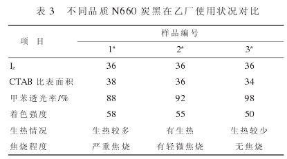 針對乙廠的生產(chǎn)工藝條件,本公司對供乙廠的 N660炭黑某些品質(zhì)指標(biāo)進行了調(diào)整。乙廠因設(shè)備原 因,在過濾時采用了較高的濾膠溫度,因此要求炭黑 的生熱量較低,因為如果炭黑生熱量高,膠料在過濾時會生熱,使濾膠溫度升高,產(chǎn)生焦燒。根據(jù)相關(guān)理 論與實踐經(jīng)驗,炭黑的生熱量主要與炭黑的CTAB 表面積、著色強度及甲苯透光率有關(guān),CTAB表面積 越高,生熱量越高,著色強度越高,生熱量越高。而CTAB表面積與甲苯透光率有關(guān),甲苯透光率反映 的是炭黑表面殘油量高低。表面殘油量低,甲苯透 光率高,CTAB表面積相對較低;炭黑的著色強度取 決于原生凝聚體尺寸大小及分布。為了適應(yīng)乙廠的工藝要求,本公司從改變炭黑原生凝聚體分布上降 低著色強度,使炭黑的生熱量降低。不同CTAB比表 面積、甲苯透光率、著色強度的N660炭黑在乙廠使 用情況對比見表3。