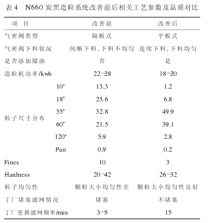 為解決本公司N660炭黑在丁廠生產(chǎn)過程中出 現(xiàn)的堵塞過濾網(wǎng)、更換過濾網(wǎng)頻繁的問題,技術(shù)人員 經(jīng)過對濾網(wǎng)上殘留物的研究,終于找出其堵塞濾網(wǎng) 的原因是由于炭黑粒子大小不均勻所致。密煉機混煉時,炭黑與膠料混合,如果炭黑粒子大小不均勻, 需要的破碎力及剪切力不同,易導(dǎo)致炭黑在膠料中 分散不均勻,有些炭黑成團存在于膠料中,過濾時就 會堵塞過濾網(wǎng),影響生產(chǎn)效率。原因找出后,技術(shù)人員對炭黑的造粒過程進行了分析,認(rèn)為炭黑粒子不 均勻主要是因為下料氣密閥下料不均勻,造粒機功 率波動大。因此技術(shù)人員對下料氣密閥進行了改進, 原下料氣密閥為隔板式氣密閥,間歇式下料,下料不均勻。改造后的氣密閥為平板氣密閥,連續(xù)均勻下 料。造粒時在造粒水中增加煤油,降低造粒機的功 率,增加炭黑粒子的光滑度和均勻度。對造粒粒子改 善前后的相關(guān)工藝參數(shù)及品質(zhì)對比見表4。