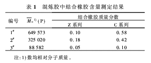 橡膠中添加炭黑、白炭黑等是其主要補強方式,填料加入到橡膠中能與基體形成不溶于橡膠良溶劑的結合橡膠。橡膠分子鏈的部分鏈段通過物理或化學作用吸附于填料表面,同一段橡膠分子的不同鏈段被不同填料粒子吸附而起到橋梁作用,并包裹填料,高分子鏈相互纏結在填料表面形成不溶的結合橡膠層。研究表明,結合橡膠含量隨混煉膠停放時間的延長而增大,最后達到飽和;結合橡膠的穩(wěn)定過程是一個小分子鏈逐步被大分子鏈取代的過程[1]。因此,橡膠的相對分子質量是影響結合橡膠的重要因素。
