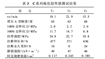 (2)原位改性(C系列,P1,P2和P3改性后分別編號C1,C2和C3):與直接共混一樣,將白炭黑加入到SSBR中并同步加入偶聯(lián)劑Si69,混煉完畢后,于Haake流變儀(美國Thermo Electron公司產品)中145℃×6.6 min熱處理即可。