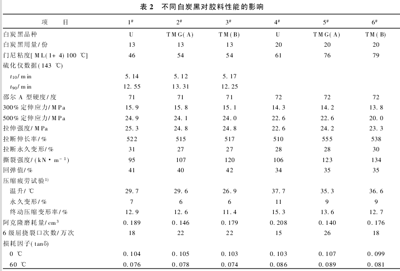 (1)白炭黑TMG(A)膠料的耐磨、壓縮生熱和抗?jié)窕阅軆?yōu)于白炭黑U膠料。