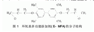 天然標準橡膠(SCR5):國營東風農場產品;高耐磨爐法炭黑(N330),通用爐法炭黑(N660):撫順炭黑股份有限公司產品;硬脂酸[CH3(CH2)16COOH],氧化鋅(ZnO),防老劑[PBNA(N-phenyl-β-naphthylamine)],防老劑[IPPD(N-isopropyl - N′- phenyl - p - phenylene di-amine)]:購于吉林市化工輕工總公司;環(huán)氧基多功能添加劑(E-MFA):自制,其結構式見圖1。