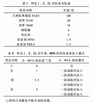 樣品Ⅰ,Ⅱ,Ⅲ,Ⅳ的基本組成和E-MFA的添加量與加入模式分別列于表1、表2。在XSS-300型轉矩流變儀上,先將天然生膠塑煉,然后加入表1、表2所示各種配合劑進行混煉?;鞜挄r間為13 min,混煉溫度為120℃,轉子轉速為32r/min。密煉腔填充因子為0.75。排膠停放一段時間后,進行二段混煉,轉子轉速不變,混煉溫度為80℃,以使基體與填料之間充分混勻。最后,將膠樣在110℃左右壓延成2 mm勻厚的薄片,為保證樣品和萃取液接觸面積一致,采用直徑約為10 mm的圓形切刀切取樣片,得到質量約0.3g的均勻的圓柱形萃取樣品。