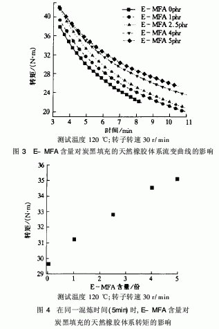 混煉時間的指數(shù)絕對值代表了混煉扭矩對混煉時間的依賴程度[7]。指數(shù)絕對值越大則依賴程度愈大。由表5的指數(shù)值可以看出,隨E-MFA含量的增加,混煉時間指數(shù)的絕對值呈減小的趨勢。說明E-MFA的加入減小了扭矩對時間的依賴性。