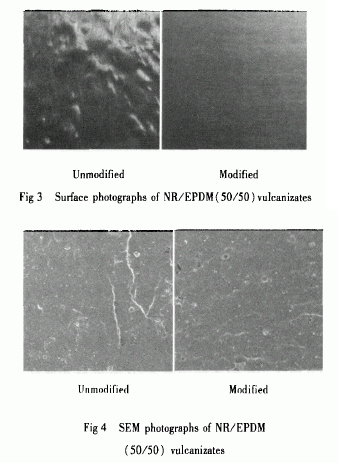 從圖4可以看出,未改性時EPDM在NR/EPDM中的分散狀態(tài)很差,存在破損的表面;改性后的試樣斷面具有更為均勻的構(gòu)造和外觀,具有較未改性時高得多的致密程度。這說明EPDM炭黑混煉膠經(jīng)原位改性后與NR的硫化相容性得到顯著改善。