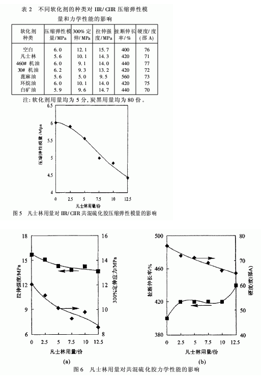 軟化劑對IIR/CIIR混煉膠加工性能有明顯的改善。常用幾種軟化劑對IIR/CIIR共混硫化膠的壓縮彈性一和力學(xué)性能如表2所示。從表2可以看出,添加不同軟化劑的IIR/CIIR共混硫化膠壓縮彈性模量相差不大,與空白試樣也相差不大,這可能是由于軟化劑用量不大而炭黑用量較高的原因。添加軟化劑之后300%定伸應(yīng)力。拉伸強(qiáng)度,邵A硬度都有不同程度的下降,但是扯斷伸和率提高了。
