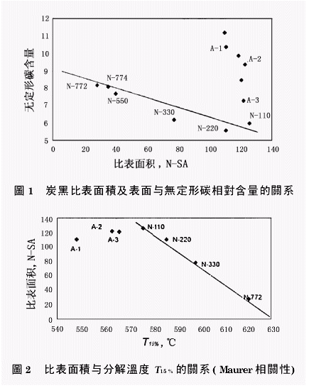 對于無定形碳相對含量較高的品種,利用TGA和IGC分析也檢測出了高的表面活性。所以,盡管無定形炭黑含量對復合材料的結構和最終性能起著重要作用,然而,為了設計出具有所預期的補強性能的材料,炭黑生成時獲得的表面活性似乎也是一個有待研究的重要參數。