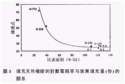 采用先前所述的膠料(見表1),對于N110、N220、N550、N772和A 1、A 2、A 3,分散度與電阻率相關。獲得的結果証實,正如文獻所描述的那樣,滲透點是由炭黑的粒徑決定的。在這種情況下,A X品種的這個值與其比表面積一致。但是在其他的研究中,對高RSA的炭黑觀察到滲透點比預期的要低。這一事實可能歸因于較高的填料 填料相互作用,這樣的作用會導致炭黑在聚合物內形成通道,降低其電阻率水平。不過,如果類似的事情發(fā)生在A X品種上,就很難被檢測出來,這可以從圖3中觀察到。在該圖中,這些炭黑的滲透點位于斜率非常小的區(qū)域,使得我們難以看出其差異。