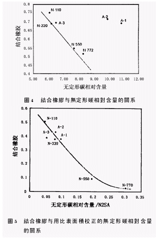 對含60份的N110、N330、N550、N772和A 1、A 2、A 3的膠料進行了測定用有機溶劑抽提后殘余在填料表面橡膠量的實驗。結合橡膠值(BR)提供了聚合物基質與炭黑網絡之間相互作用的信息。乍一看圖4,表面上無定形碳的含量似乎并沒有在這一現象中起到實質性的作用,因為不同的實驗炭黑其結合橡膠含量非常接近。而另一方面,如果通過其比表面積來校正無定形碳含量,就發(fā)現所有品種的相關性均要好于表明BR與比表面積本身之時(圖5)。因此,雖然它可能不是主要的相關因素,但由于比表面積代表暴露于聚合物基質的填料總表面積具有很強的影響,無定形碳對填料聚合物相互作用起著次要的作用。
