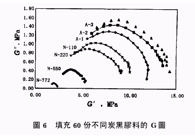 從圖6中可以看出,對于N110、N220、N550、N772,填料的比表面積減小招致G1?和G?值減小。當配方中包含有這些炭黑時,這種現象可能是填料 填料相互作用較強的標志。在其他對填充有高RSA炭黑橡膠膠料的研究中,亦獲得了較高的G和G值。高RSA炭黑的表面活性能通過IGC(這種技術可以檢測出高極性的成分來測定。應該指出的是,在初步的研究中對A1也發(fā)現了高特殊極性成分。但是,不僅該參數在這,兩種填料(高RSA和高無定形碳含量)之間是常見的,而且它們背離Maurer相關性也表明了不同于常規(guī)炭黑的行為。