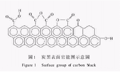 炭黑粒子是準(zhǔn)石墨單元結(jié)構(gòu),而粒子中碳塬子以共價(jià)鍵結(jié)合形成正六角形網(wǎng)狀平面,可視為稠環(huán)芳烴結(jié)構(gòu),在其表面有許多的含氧官能團(tuán),如羧基、羥基、內(nèi)酯基和 基等[2,3],如圖1所示。利用稠環(huán)芳烴的吸收自由基能力和表面含氧官能團(tuán)的反應(yīng)能力,可在炭黑表面接枝高分子聚合物,炭黑表面接枝塬理可分為以下叁種[1]: