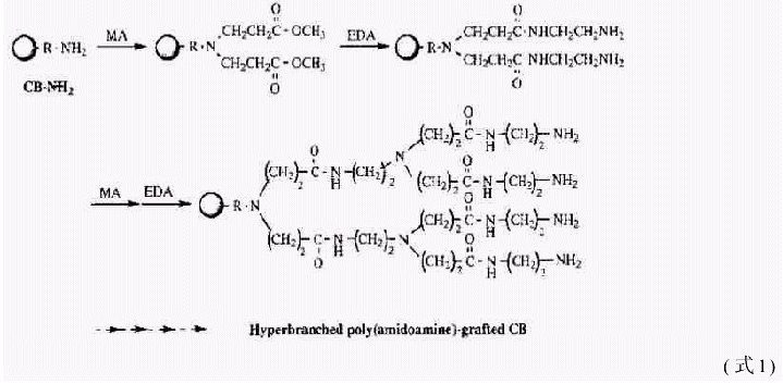 為了提高接枝率可用二次接枝的方法,炭黑的二次或多次接枝是在炭黑表面先進(jìn)行聚合物接枝(一次接枝),然后對(duì)接枝聚合物鏈的側(cè)基進(jìn)行處理,引入偶氮基、過氧酯基、 基高氯酸基、氨基等基團(tuán),這些基團(tuán)再引發(fā)單體進(jìn)行聚合接枝或反應(yīng)接枝(二次接枝),這樣不僅在炭黑表面導(dǎo)入了高度分枝的聚合物接枝鏈,而且接枝率大,且二次(或多次接枝)可使枝狀聚合物接枝到炭黑上[4~6]。