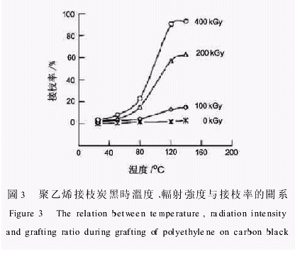 圖3[7]顯示聚乙烯接枝到炭黑表面時(shí)照射強(qiáng)度、溫度和接枝率的關(guān)系。該方法工藝簡單,對(duì)接枝高分子的種類、結(jié)構(gòu)、分子量等都可做出選擇,在較高的輻射量下其接枝量也較大,此方法應(yīng)注意的是,吸附后炭黑中的溶劑應(yīng)盡可能除去,否則會(huì)極大地影響到炭黑接枝率。另一個(gè)不利的因素是在γ 射線輻射的情況下, 表面接枝聚合物可能發(fā)生部分的交聯(lián),從而影響接枝炭黑的性能。
