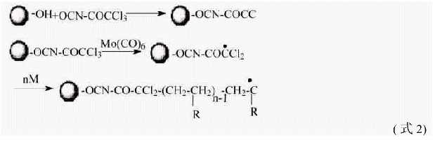 用叁氯乙異氰酸酯處理炭黑可在炭黑上引入叁氯乙 基團(tuán),含有叁氯乙 基團(tuán)的炭黑在六羰基鉬的作用下可以成功地引發(fā)乙烯基單體如甲基丙烯酸甲酯、甲基丙烯酸縮水甘油酯等的聚合反應(yīng)。聚合物的生長是基于叁氯乙 基團(tuán)與六羰基鉬形成的表面自由基,如式2[10]所示: