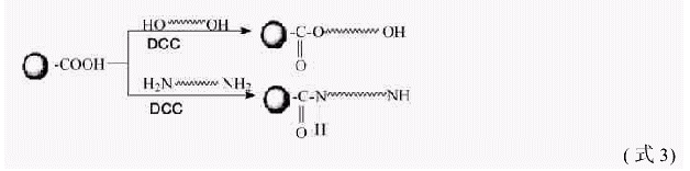 活性炭黑與具有活性端基的高聚物反應(yīng)接枝,其優(yōu)點(diǎn)是接枝量較高,接枝的分子量和分子鏈數(shù)易于控制??s合劑也能將炭黑與高聚物分子接枝,利用DCC(N,N’ 二環(huán)己基碳二亞胺)作縮合劑[11]、鈦酸酯等偶聯(lián)劑[12],可以容易地將炭黑表面的—COOH或—OH基團(tuán)與具有端—OH基或端—NH2基的高分子偶聯(lián)接枝,見式3[11]: