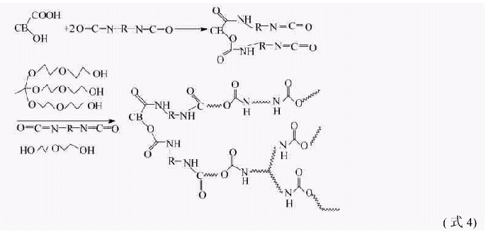 在炭黑上也可接枝網(wǎng)絡(luò)狀交聯(lián)聚氨酯[13],其方法是首先把炭黑用二異氰酸酯進(jìn)行預(yù)聚處理,然后加入聚二醇或聚叁元醇,在二異氰酸酯存在的情況下交聯(lián),見式4[13]。也可以在接枝后利用電子束照射的方法使被接枝的聚合物交聯(lián)[14]。