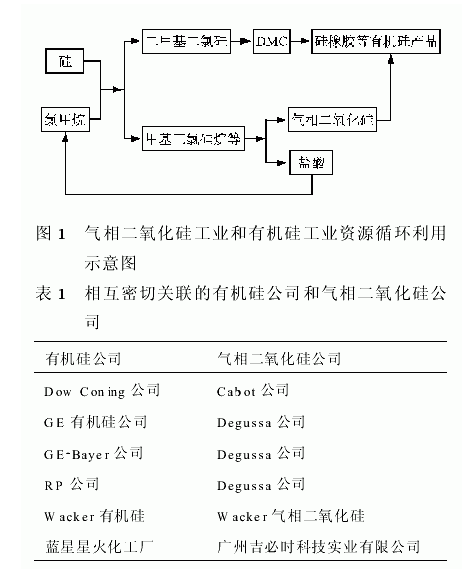 氣相二氧化硅新工藝的出現(xiàn),改變了氣相二氧化硅工業(yè)的發(fā)展模式,使得氣相二氧化硅工業(yè)和有機(jī)硅單體工業(yè)之間的關(guān)系更加密切,它解決了有機(jī)硅單體工業(yè)副產(chǎn)物的處理問題,在氣相二氧化硅生產(chǎn)過程中的副產(chǎn)物(鹽酸)可返回有機(jī)硅單體合成車間,用于單體的合成,而生產(chǎn)的氣相白炭黑產(chǎn)品則大部分用于有機(jī)硅產(chǎn)品的后加工,這樣形成了資源的循環(huán)利用。因此,氣相二氧化硅生產(chǎn)企業(yè)大多選擇在大型有機(jī)硅單體公司附近設(shè)廠,二者密切合作,相互促進(jìn)發(fā)展。圖1是氣相二氧化硅工業(yè)和有機(jī)硅工業(yè)資源循環(huán)利用示意圖,圖1是相互密切關(guān)聯(lián)的有機(jī)硅公司和氣相二氧化硅公司,它們都是相互在附近設(shè)廠,相互促進(jìn)發(fā)展,取得了極好的社會經(jīng)濟(jì)效益。