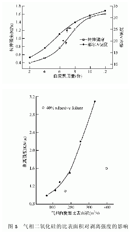 氣相白炭黑是RTv硅橡膠非常有效的補(bǔ)強(qiáng)填料,可以顯著提高其強(qiáng)度。一方面,是由于氣相二氧化硅粒子的小尺寸效應(yīng)和大的比表面積;另一方面是因?yàn)槠浔砻婧泻芏喙栎p基,粒子可以通過氫鍵和范德華力的作用形成網(wǎng)絡(luò)結(jié)構(gòu),同時二氧化硅粒子還會與聚硅氧烷分子產(chǎn)生強(qiáng)烈的相互作用,改善了界面狀況。圖4是氣相白炭黑用量對RTV硅橡膠拉伸強(qiáng)度和邵爾A硬度的影響(氣相二氧化硅的比表面積為153m2/g),圖5是氣相二氧化硅的比表面積對RTv硅橡膠剝離強(qiáng)度的影響,圖6是氣相白炭黑的用量對RTv硅橡膠的撕裂強(qiáng)度的影響。