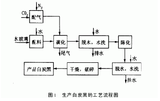 工業(yè)水玻璃經(jīng)加水調(diào)濃,過濾精制后,加入反應器中,水浴加熱,升溫到一定溫度,通入原料氣進行碳化反應。反應完后將漿液沉淀洗滌,再真空抽濾,把濾餅放入烘箱中干燥,破碎后即可得到白炭黑產(chǎn)品,實驗流程見圖1.