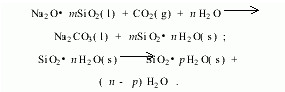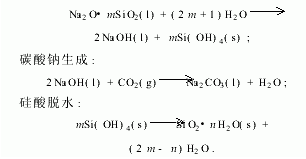 上述反應式僅為示意式,實際情況不會如此簡單。水玻璃溶液同時具有溶液和膠體性質(zhì),它的膠體性質(zhì)對它與其它物質(zhì)反應的中間物質(zhì)和最終產(chǎn)物有很大影響。它是一種混合物,其中包括堿金屬硅酸鹽、無定型二氧化硅、水合物和氫氧化物,反應過程無疑是復雜的。水玻璃吸收二氧化硅的反應歷程,一般認為首先是水玻璃水解成氫氧化鈉和硅酸,再由氫氧化鈉與二氧化碳反應生成硅酸鈉。反應方程式如下。