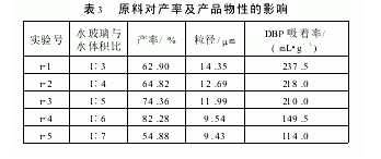 固定反應溫度(80℃)、反應時間(2h)、原料氣組成(V(CO2)∶V(N2)=2∶3)、通氣速率(60mL/min)及攪拌速率(3r/s)等因素,通過改變水玻璃與水的配比(體積比)來改變原料濃度,對水玻璃與水的體積比選取了5個水平進行反應,結(jié)果見表3.由表3可見,隨著原料濃度的逐漸減小,產(chǎn)率先增大后減小,但是白炭黑粒徑越來越小,DBP吸收值也在減小。上述結(jié)論可解釋為[5,6]:水玻璃的粘度隨濃度的增加而升高,反應物濃度過高,水玻璃粘度高,這便不利于CO2由氣相主體傳向液相主體,致使反應速率下降。因此,當反應物濃度由高到低變化時,產(chǎn)率升高;但濃度太低,體系中水玻璃太少,自然產(chǎn)率低,且能耗高,不經(jīng)濟。而且,隨著反應物含量的降低,當水玻璃與水體積比為1∶7,原料含量太低,達不到核晶生成所需的過飽和度,也就形成不了核晶,或者即使有核晶形成,也會由于溶液中可利用的物質(zhì)較少而限制了核晶的增長,致使白炭黑聚集體一次結(jié)構的聚合度低,最終形成緊密、堅實的白炭黑聚集體,這種結(jié)構的產(chǎn)品孔隙少,比表面積低,DBP吸著率低。因此,原料濃度的調(diào)節(jié)可綜合考慮經(jīng)濟指標,選取合適的稀釋度。