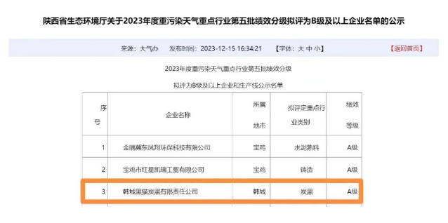 韓城黑貓獲評(píng)A級(jí)企業(yè),引領(lǐng)炭黑行業(yè)綠色發(fā)展