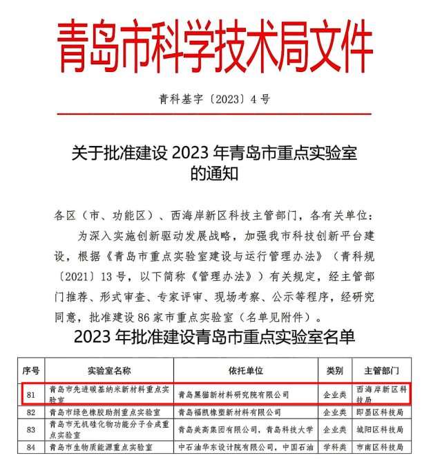 青島黑貓新材料研究院獲批建設(shè)先進(jìn)實(shí)驗(yàn)室