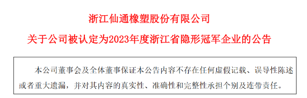 【炭黑產(chǎn)業(yè)網(wǎng)】1月12日消息,浙江仙通橡塑股份有限公司在1月11日晚間發(fā)布了一則重要公告。根據(jù)浙江省經(jīng)濟和信息化廳的最新通知,該公司榮獲2023年度浙江省隱形冠軍企業(yè)的殊榮。