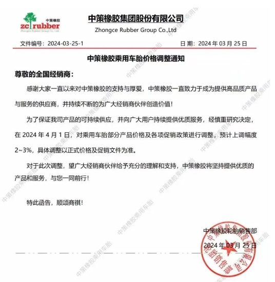 【炭黑產(chǎn)業(yè)網(wǎng)】3月26日消息,中國(guó)輪胎行業(yè)的領(lǐng)軍企業(yè)中策橡膠于近日發(fā)布了第二張漲價(jià)通知單,宣布自4月1日起,將對(duì)乘用車(chē)胎部分產(chǎn)品進(jìn)行調(diào)整,并相應(yīng)地上調(diào)各項(xiàng)促銷(xiāo)政策,預(yù)計(jì)上調(diào)幅度在2%至3%之間。這一舉措引起了行業(yè)內(nèi)外的廣泛關(guān)注。