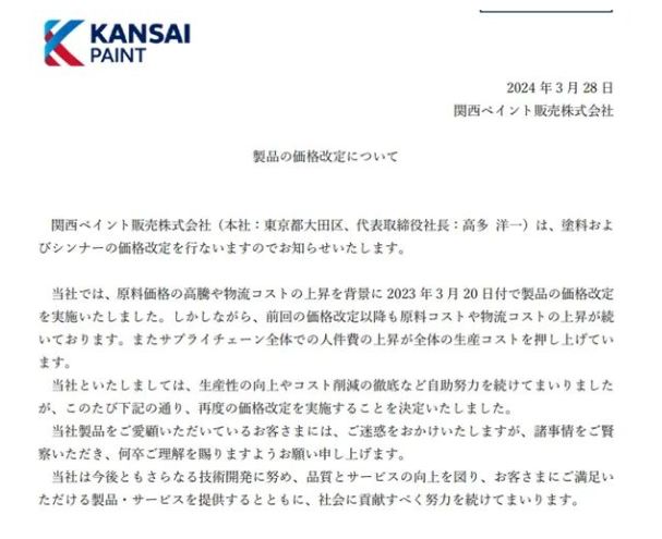 公司方面表示,受全球原材料價格持續(xù)上漲及物流成本不斷增加的雙重影響,公司經(jīng)營成本已承受巨大壓力。為確保產(chǎn)品品質(zhì)的持續(xù)穩(wěn)定與研發(fā)投入的必要保障,關(guān)西涂料決定對部分產(chǎn)品進(jìn)行價格調(diào)整。此舉旨在平衡成本負(fù)擔(dān),維持企業(yè)的健康發(fā)展,并為客戶提供更為持久可靠的產(chǎn)品與服務(wù)。