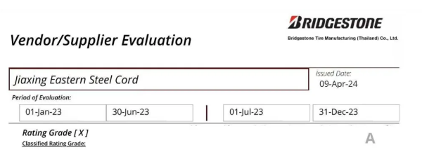 嘉興東方鋼簾線連續(xù)獲評(píng)普利司通泰國“A”級(jí)供應(yīng)商
