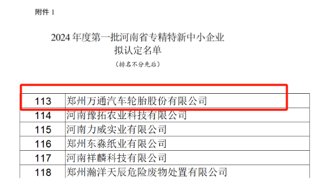 鄭州萬(wàn)通汽車輪胎榮獲河南省專精特新企業(yè)稱號(hào)