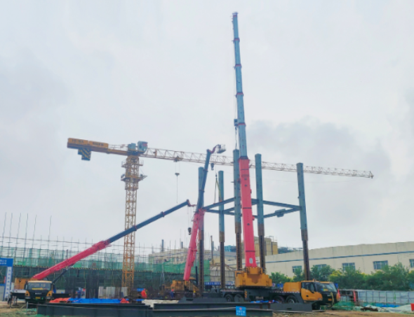 此次安裝的鋼結(jié)構(gòu)一層框架具有相當(dāng)高的技術(shù)要求。整個(gè)安裝過(guò)程涉及到25米的安裝距離,以及高達(dá)21.6米的高度,單根鋼柱的重量更是超過(guò)了10噸。面對(duì)這樣的技術(shù)挑戰(zhàn),十三化建的項(xiàng)目部進(jìn)行了深入且細(xì)致的策劃與部署。他們不僅優(yōu)化了施工流程,還加強(qiáng)了現(xiàn)場(chǎng)的組織協(xié)調(diào)工作,成功克服了施工難度大、場(chǎng)地空間有限等諸多難題,確保了安裝任務(wù)的順利完成。
