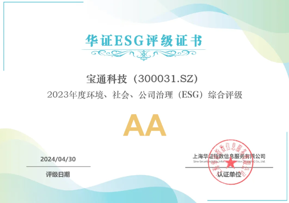 寶通科技ESG表現卓越,獲華證指數AA評級