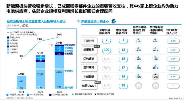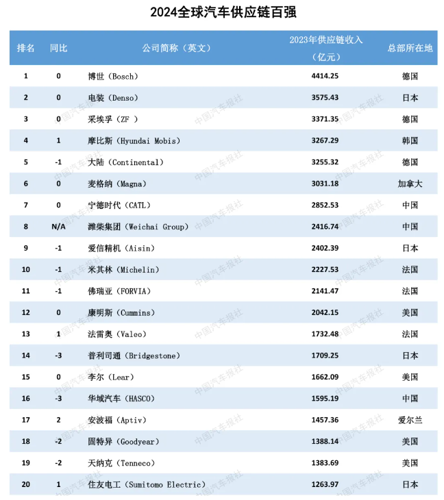 2024“全球汽車供應(yīng)鏈百?gòu)?qiáng)”中,有3家中國(guó)企業(yè)進(jìn)入前二十,分別是寧德時(shí)代、濰柴集團(tuán)和華域汽車,這代表著中國(guó)零部件企業(yè)的深厚積累與創(chuàng)新能力,也向世界展示了中國(guó)企業(yè)在全球汽車供應(yīng)鏈中不可或缺的角色和地位。