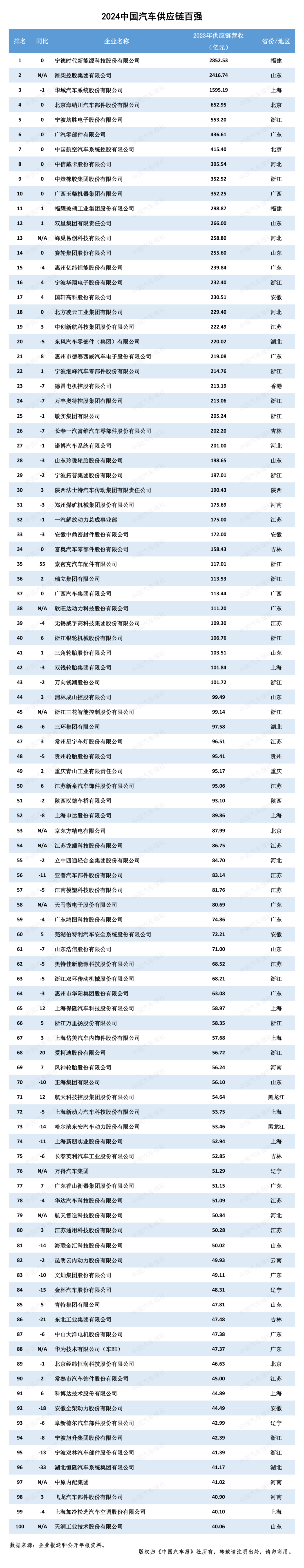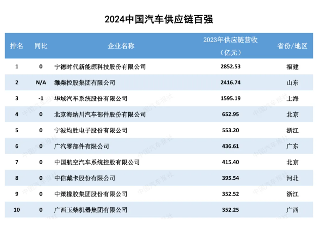 2024“中國(guó)汽車供應(yīng)鏈百?gòu)?qiáng)”排名前十位的企業(yè)分別是寧德時(shí)代、濰柴集團(tuán)、華域汽車、海納川、均勝電子、廣汽部件、中航汽車系統(tǒng)、中信戴卡、中策橡膠和廣西玉柴,覆蓋了動(dòng)力電池、傳統(tǒng)動(dòng)力、汽車電子、輪胎、輪轂以及綜合性零部件企業(yè)。