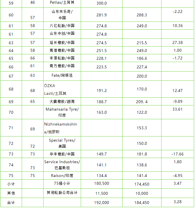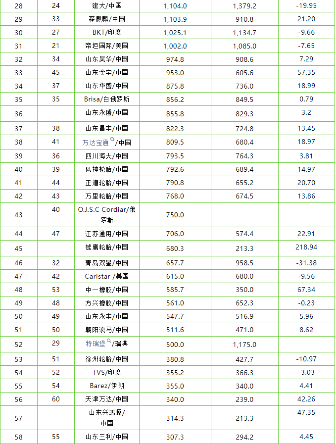 中國企業(yè)山東永盛橡膠、雄鷹輪胎和山東星宏源輪胎有限公司今年首次上榜。另外,第四家新公司是印度的Mahansaria Tyres公司,該公司首次亮相時排名第70,銷售額為1.63億美元。